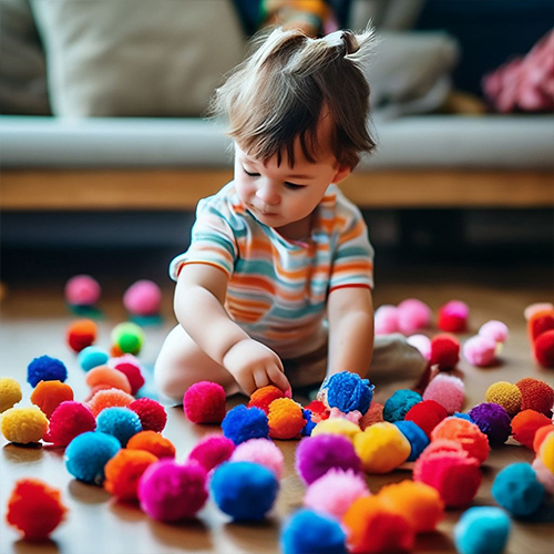- Развитие мелкой моторики: Перебирание, сортировка и перекладывание помпонов стимулируют развитие мелких мышц рук, что напрямую связано с развитием речи.